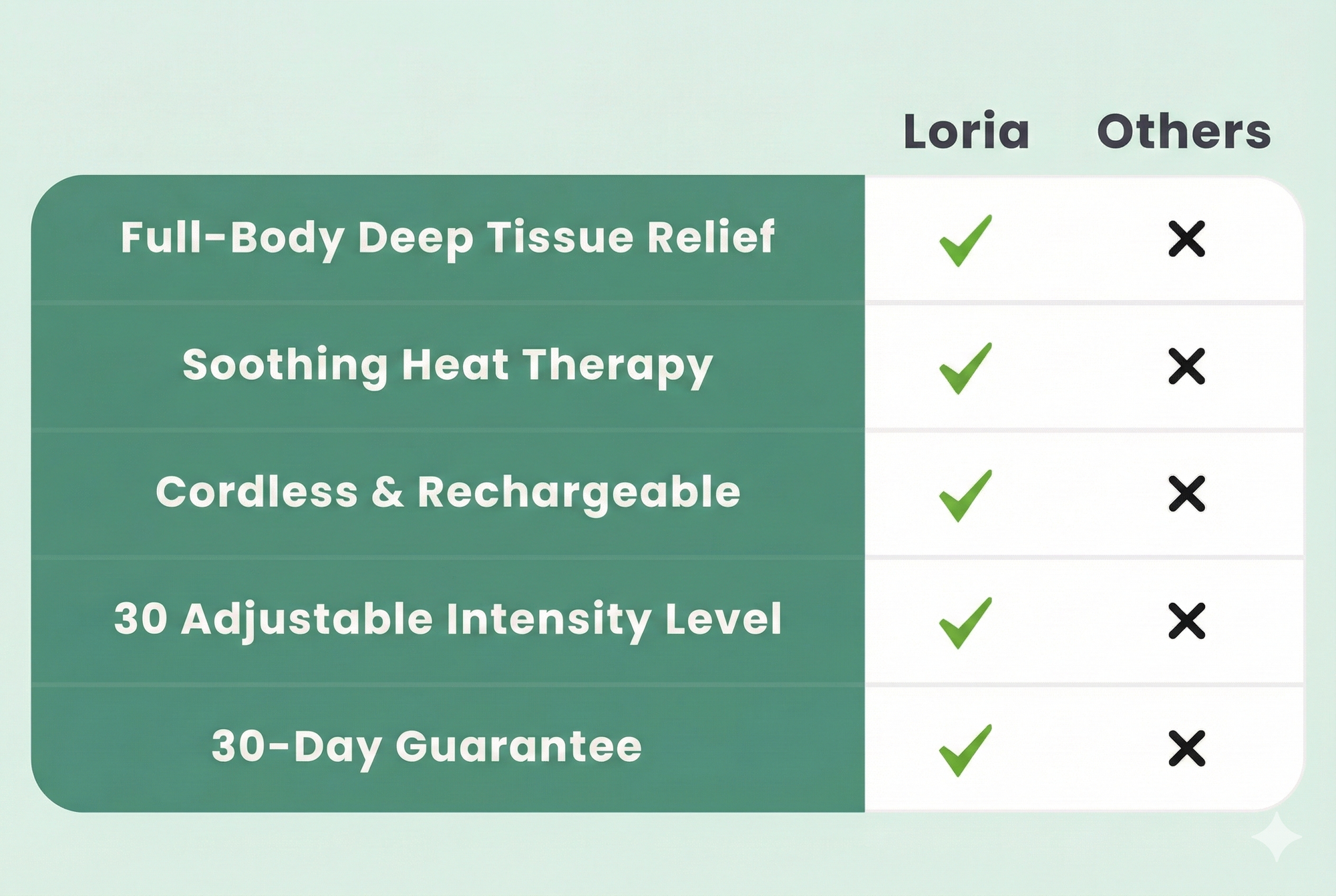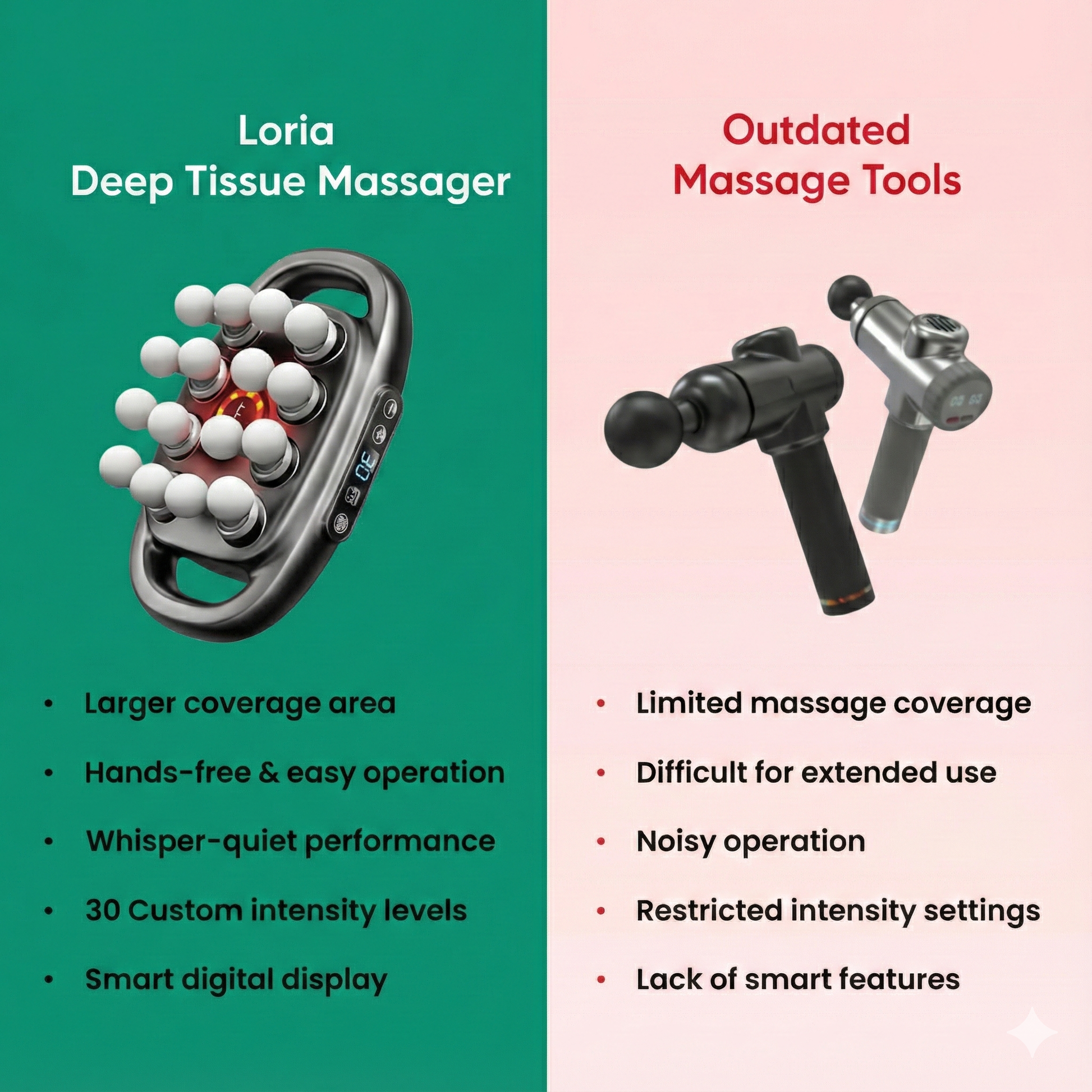 Loria combines percussion therapy + multi-point massage technology to deliver deep, effective relief in minutes.