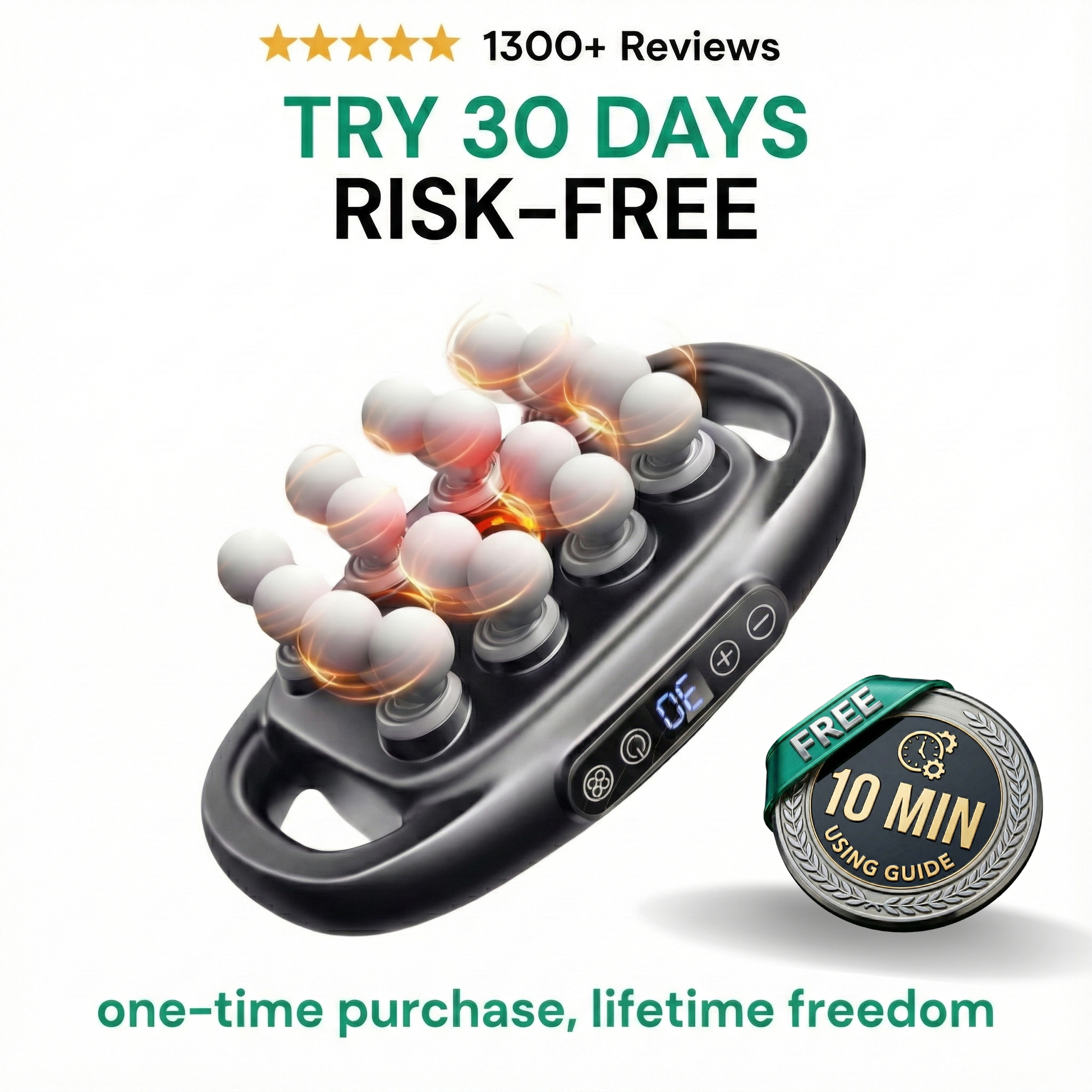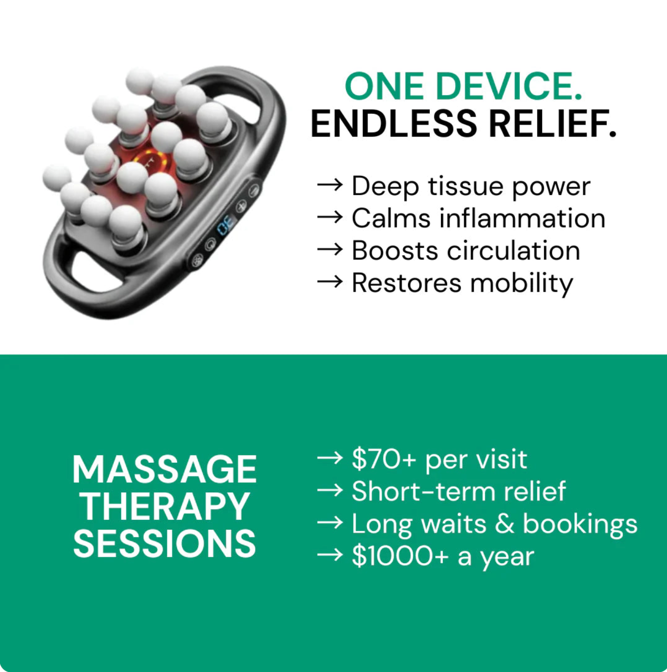 This means you get professional-grade relief in your living room. After canceling your next couple appointments, you already made your money back and never have to pay a chiropractor again. So basically, saving money, saving time and being able to relief pain & stiffness wherever, whenever. Replacing endless appointments with a one-time solution.